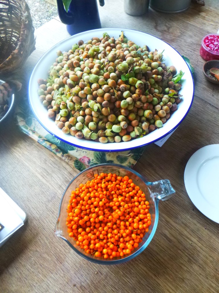 Neither of us has had the opportunity to pick sea buckthorn berries before, but for a couple of months we’ve had our eyes on these bushes and, after picking an exploratory few with Richard, went picking in earnest last weekend. The almost luminous orange berries have a sharp, fragrant taste and, clustered close to the branches amongst fine sharp thorns, can’t simply be stripped. Each berry must be picked individually and it took us a little time to find a technique that seemed practical. When we felt we’d taken enough we moved to another location in search of nuts. The hazel grove lies in a contour-hugging scoop, a couple of hundred metres long, just below the heathery top of a ridge. It’s backed by small cliffs with twisting oaks on them arching over the hazels. The sense of place is unique and powerful and every time we descend into it we feel we’re entering a realm where the ancient past is still present.